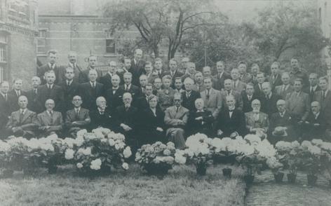 1. Groepsfoto van de professoren en assistenten van de faculteit Geneeskunde, bij gelegenheid van de terugkeer van dr. Raphaël Schotte uit Buchenwald. Van 1931 tot 1938 was Schotte assistent van professor De Beule - de school der chirurgie bij uitstek - aan de Gentse Rijksuniversiteit.